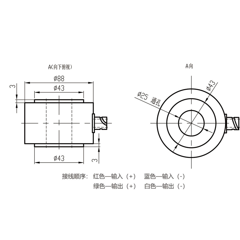 紅——輸入(+);藍(lán)——輸入(-);綠——輸出(+);白——輸出(-)